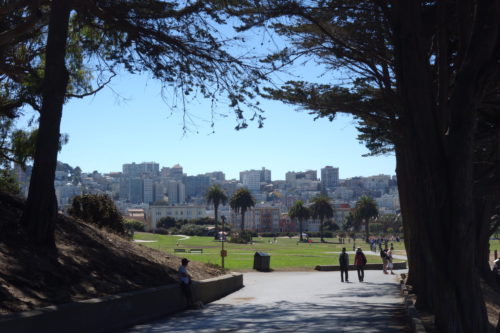 Angekommen am Bahnhof von San Francisco müssen wir nur ein paar Minuten auf dem Gehsteig radln bevor der Radweg am Kai beginnt. So nett ists hier zu fahren. Links die City, rechts das Meer. Gesäumt wird das ganze von Palmen und, wir befinden uns schließlich mitten in einer Stadt, Autos.