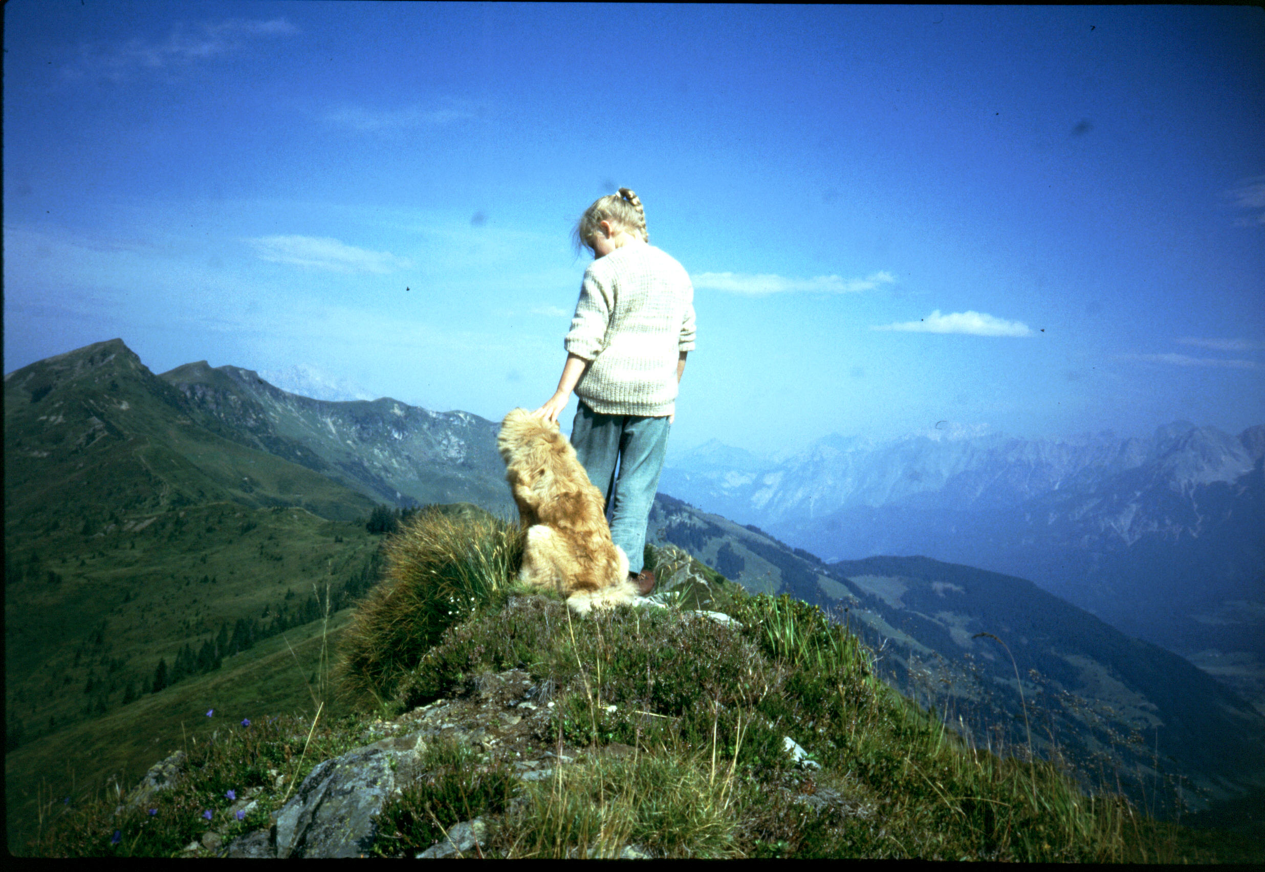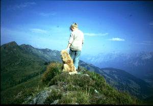 Kiki steht mit ihrem Hund Gisaia auf einem Berggipfel in Osttirol