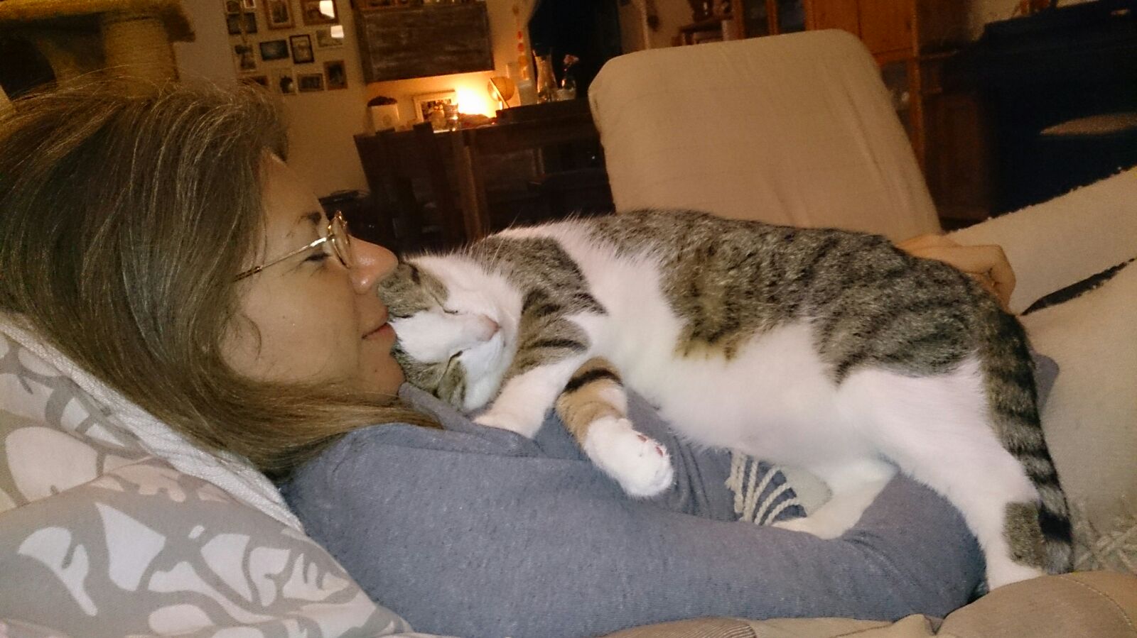 Kikis Katze Pedro liegt auf ihrem Schoß